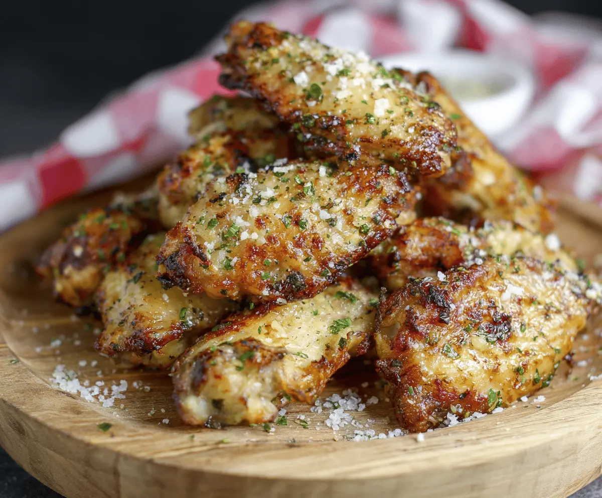 Golden crispy Air Fryer Buttery Parmesan Garlic Wings garnished with fresh herbs on a white plate, perfect for a delicious appetizer or snack